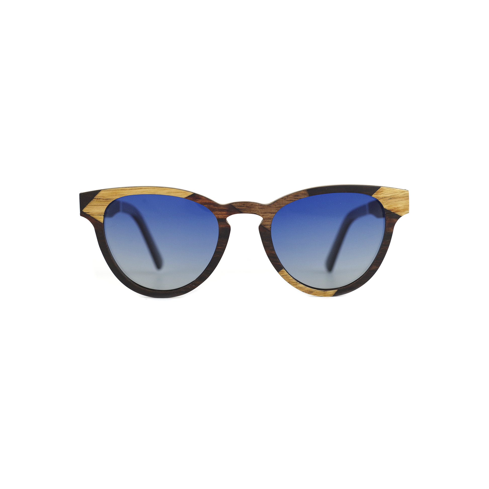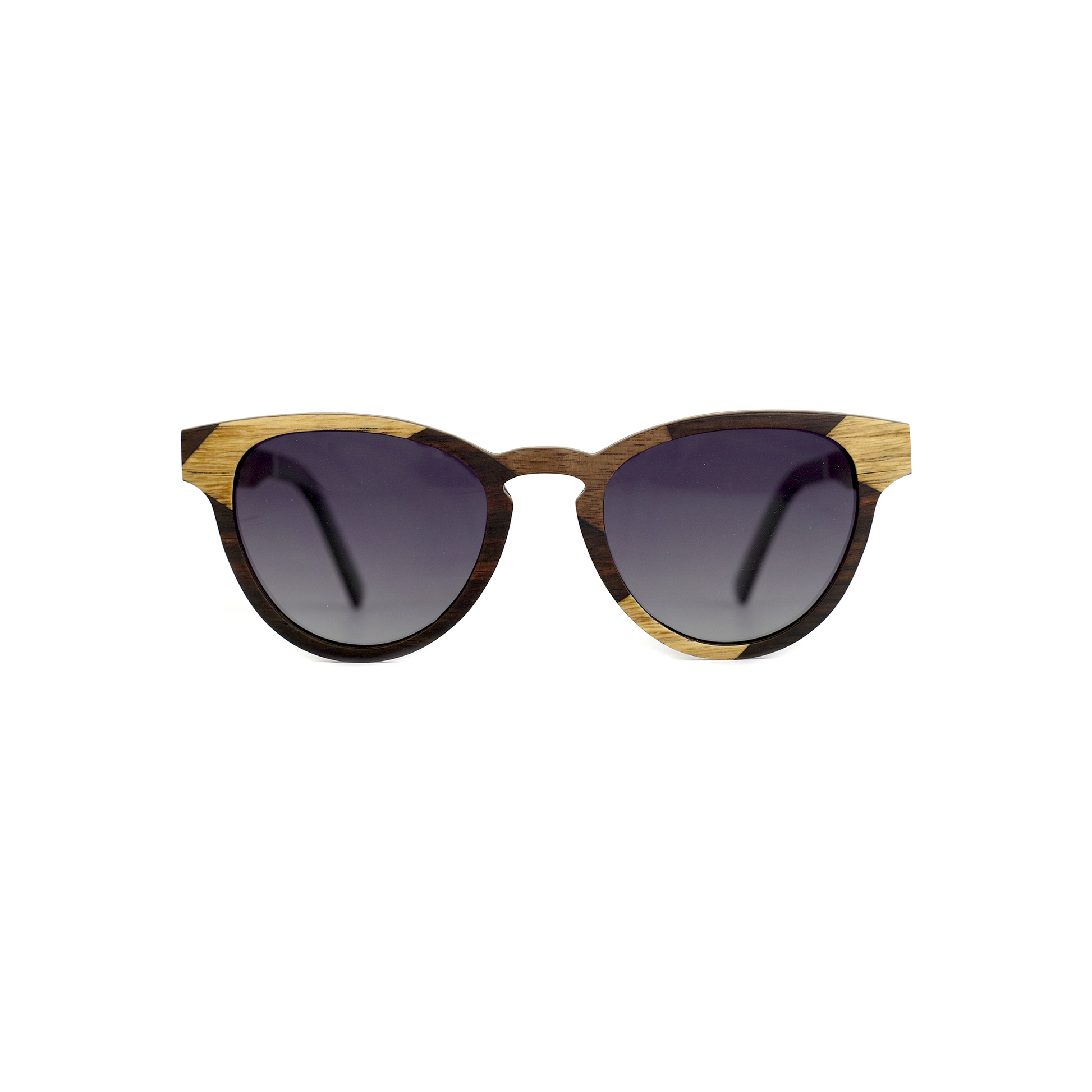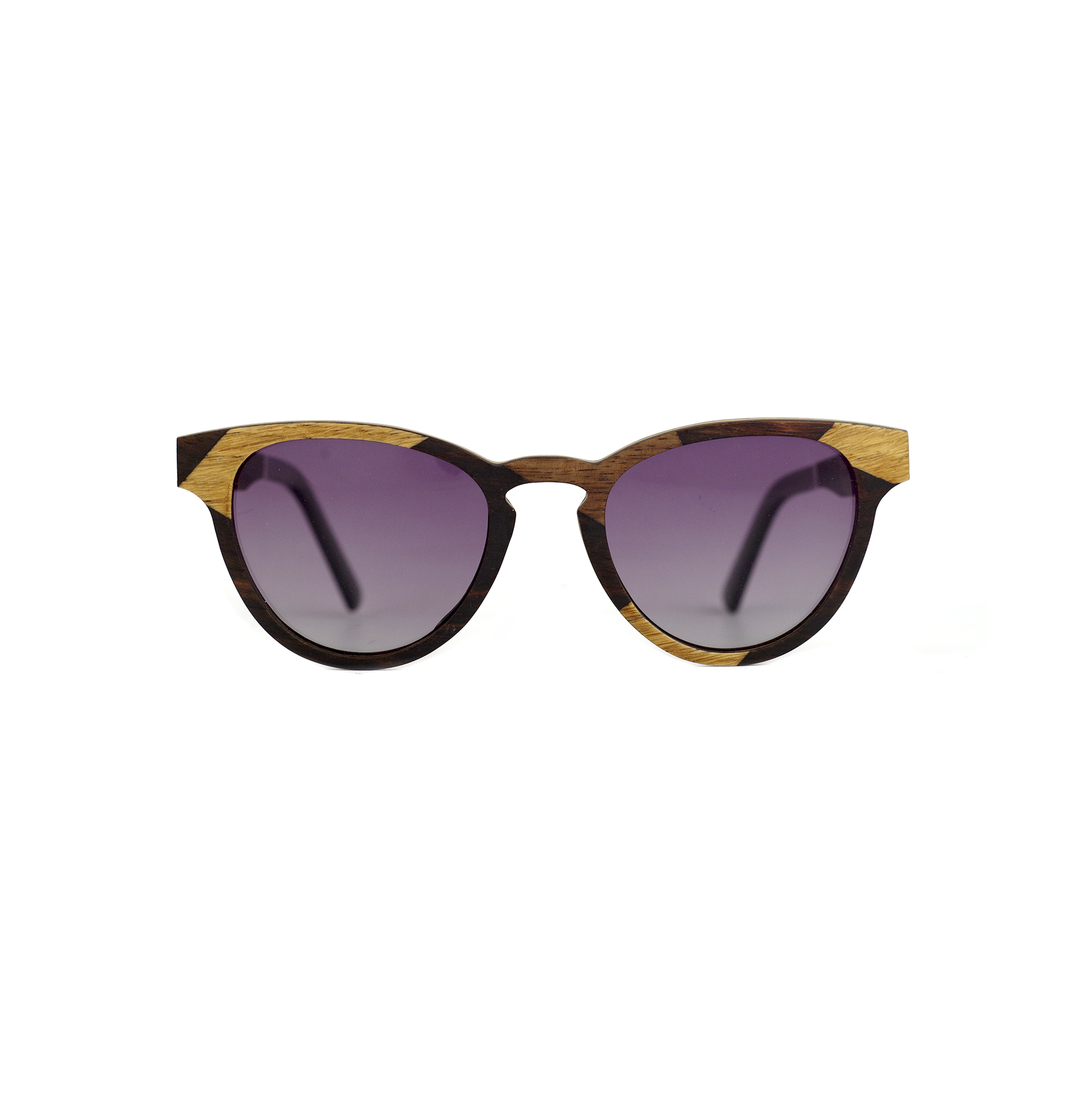 A template of wooden sunglasses out of the ordinary, with a great deal of particular work on the assembly of the woods on the front as well as on the branches.